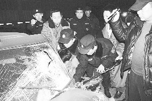 2月20日23时,邢台市区发生一起夏利轿车与停靠在路边的载重货车相撞的交通事故,夏利轿车严重变形,司机被卡在车内,生死未卜。邢台市公安局特警支队民警迅速赶往现场,与赶到的辖区派出所民警,以及消防、医务人员一起将受伤司机救出,紧急送往医院救治。