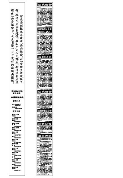《河北法治报》(电子版)的一切内容(包括但不限于文字、图片、PDF、图表、标志、标识、商标、版面设计、专栏目录与名称、内容分类标准以及为读者提供的任何信息)仅供河北法治网读者阅读、学习研究使用,未经河北法治网及/或相关权利人书面授权,任何单位及个人不得将《河北法治报》(电子版)所登载、发布的内容用于商业性目的,包括但不限于转载、复制、发行、制作光盘、数据库、触摸展示等行为方式,或将之在非本站所属的服务器上作镜像。否则,河北法治网将采取包括但不限于网上公示、向有关部门举报、诉讼等一切合法手段,追究侵权者的法律责任。
