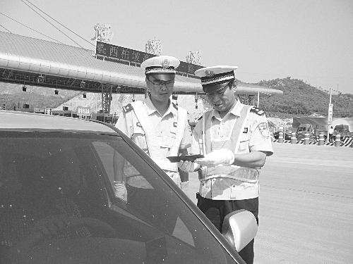 执勤民警顶着烈日对通行车辆进行例行检查