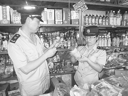 石家庄矿区工商局近期开展了农村食品安全专项整治行动,以乡(村)镇、城乡接合部、农村中小学周边等为重点区域,以农村商场、超市和食杂店为重点单位,重点查处整治与农民群众日常生活密切相关的食品,确保农村食品消费安全。图为工商人员于9月1日检查食杂店。   仇红霞 摄