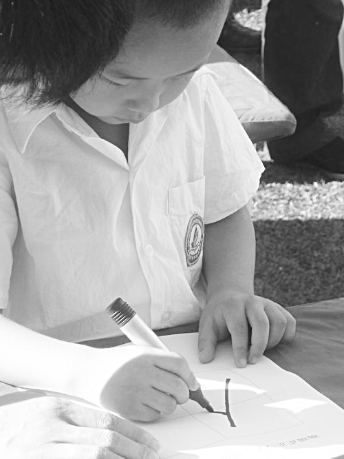 击鼓铭志、学写“人”字、感恩父母……9月3日 ,省会中华南大街小学在开学伊始开展了国学特色活动,受到了学生、家长的欢迎。图为一名新同学在老师的指导下学写“人”字。程敬霞 摄