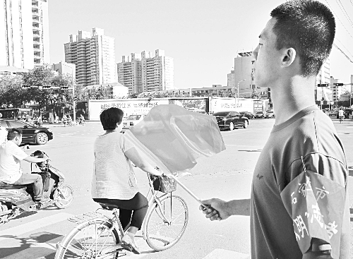 第十四届中国科协年会在石家庄召开期间,石家庄市文明引导志愿者纷纷走上街头,到市区各主要道路路口引导市民文明通行,协助交警维护交通秩序。图为志愿者在路口引导通行。      周世团 摄