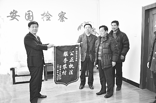 资讯图片:2010年1月,安国市检察院党组书记、检察长宋进朝带领农村检察工作队到本市大营村走访时了解到,该村有23万元通村公路建设筹资款被村委委员李某挪作他用,致使通村公路一直未能开工建设。获知情况后,宋进朝一面指派农村检察工作队做好群众的安抚工作,一面调集反贪干警以涉嫌挪用公款罪对李某立案查办,将23万元修路款悉数追回。图为大营村“两委”将一面写有“公正执法 服务农村”的锦旗送到了安国市检察院,并向检察长宋进朝(左)汇报了通村公路建设工程动工的喜讯。