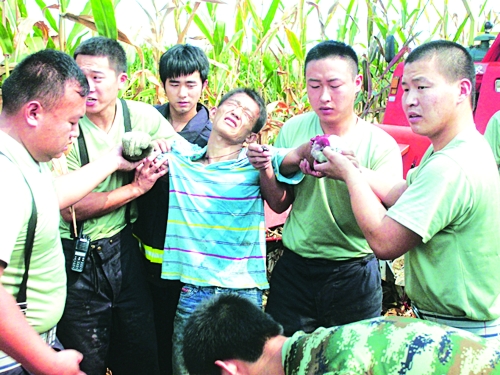 | 9月23日10时,河间市北二十里铺一村民在收割玉米时左手被绞进收割机内,情况十分危急。河间消防中队接警后立即出动2辆消防车、12名官兵前往现场。到达现场后,消防官兵发现,村民冯某的左手被收割机转轴绞住拿不出来,两个转轴之间空隙只有几厘米,冯某的手臂处一直出血,情况非常紧急。经过研究,救援官兵首先利用切割工具对收割机的转轴连接部位进行切割,把转轴连接部分切断后,再用撬棍将转轴一点一点挪动,扩大被卡转轴之间的空隙。经过半个小时的救援,冯某的左手脱离玉米收割机的转轴。随后,冯某被送往医院进行急救。图为消防官兵将冯某救出。 刘存强 摄影报道 |