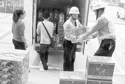 9月21日下午,廊坊市安次区银河南路街道办事处工作人员来到市交警二大队,代表广大社区居民,向奋战在执勤岗位上的民警和协警提前致以节日的问候。该大队大队长马冬代表民警感谢街道办领导和居民,表示将带领民警更好地服务于广大群众。图为工作人员向民警赠送慰问品。