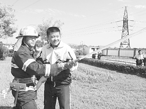9月25日上午,遵化市公安消防大队官兵结合典型案例,为100多名中学生上了一堂生动的消防安全知识课,并为学生们讲解和示范了灭火器、消防栓、防化服、消防车等消防装备的用途及使用方法。图为消防官兵与学生一起拿起脉冲水枪进行模拟灭火演练。                 本报记者 刘文利 摄