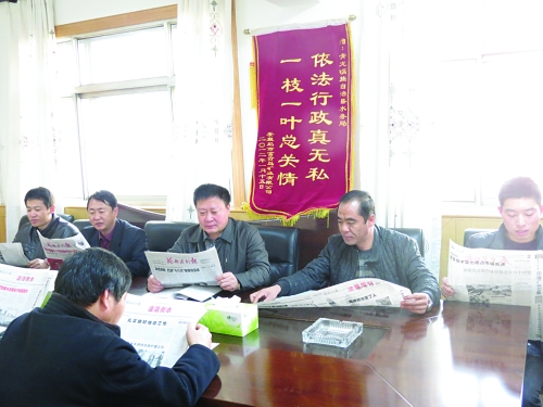 今年以来,青龙满族自治县水务局重视加强水法规宣传,创造良好的执法环境;同时,注重执法队伍法律知识的培训,提高执法队伍的整体行政能力。图为局长莫宝文(右三)组织该局部分人员认真阅读《河北法治报》,从中汲取法律知识。郑亚 摄