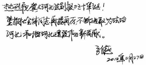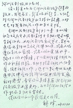 彭真委员长题写报头后不久,时任河北省委书记解峰同志(当时,省委设第一书记)专门给河北法治报社写来亲笔信以示祝贺和勉励。