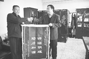 图片说明:2012年11月19日,灵寿县塔上镇许家村村民贾三国向本报群工部赠送锦旗,以感谢本报依法为其圆满解决纠纷,维护了其合法权益。图为本报社长、总编辑王更海(右)接受锦旗时的情景。
