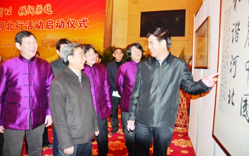 12月8日上午,由省委宣传部、省文联、省委外宣局和首都师范大学书法文化园联合举办的“善行河北、德润燕赵”知名艺术家河北行活动启动仪式在省会举行。今年初,我省开展了“善行河北”主题道德实践活动,涌现出了一批在全省乃至全国有重要影响的先进典型。参加此次活动的12位全国知名书法家将用手中的笔描绘善行河北的生动景象,书写崇德向善的美好风尚。图为启动仪式后,省委宣传部常务副部长杨永山(右)等参观艺术家的作品展览。 本报记者 龚红美 摄