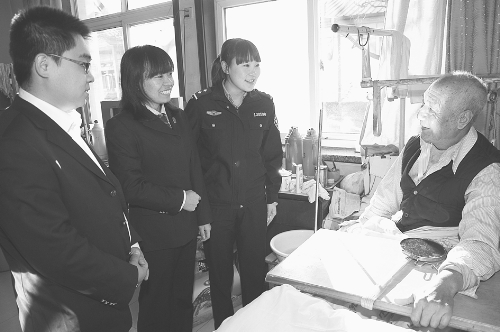 12月5日是“国际志愿人员日”。这天,唐山市中级人民法院的青年志愿者在团支部的组织下,来到唐山市截瘫疗养院开展帮扶慰问活动。图为志愿者向疗养院的老人送去礼品和温馨祝福。本报记者 刘文利 摄