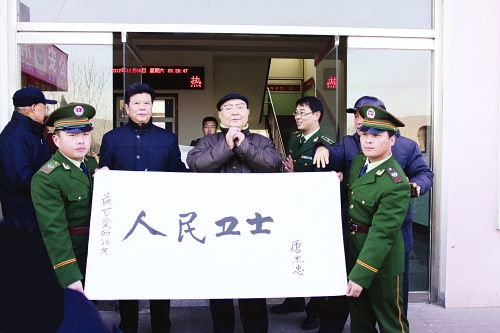 12月7日至8日,我国著名相声表演艺术家唐杰忠与弟子崔喜悦以及七位老将军和书画家组成慰问团来到革命老区易县进行慰问。唐杰忠老先生与弟子为易县消防官兵表演了精彩的节目,老将军和书画家亲自创作了多幅书画作品赠送给官兵。图为唐杰忠将自己创作的作品赠送给官兵。 本报记者 刘彬 摄