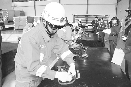 12月6日上午,石家庄市公安消防支队在战勤保障大队车库,举行了石家庄市首届装备技能大比武。来自各大队、中队的装备技师、观摩人员80余人参加、观摩了这次比武。这次装备技能比武竞赛,共分干部组和战士组两个组别,参赛人员在蒙住双眼的情况下,分别进行了无后座力水枪拆装、无齿锯拆装、机动链锯拆装、液压机动泵拆装等科目的比赛。图为比武活动现场。
