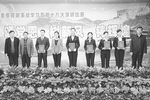 12月7日,省民政厅成功举办全省民政系统学习贯彻十八大精神“颂党恩、树新风、铸辉煌”演讲比赛。本次比赛教育活动中,来自全省民政系统的20名选手,以深入学习宣传贯彻党的十八大精神为主题,通过演讲比赛形式,歌颂了党的十六大以来民政事业取得的辉煌成就,讴歌了民政干部心系民生、爱岗敬业的精神风貌,颂扬了全系统行风建设10多年来铸就的清风正气和勤政廉政先进典型。图为部分获奖选手。