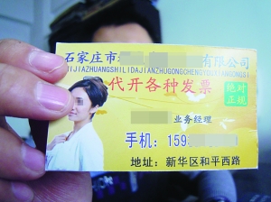 记者看到,张先生手中的这张名片,黄色的卡片正面上印着“石家庄市利达建筑工程有限公司、代开各种发票”的字样和电话号码,并用绿色显眼字体标明“绝对正规”,名片反面印着经营范围包括“货物销售、建筑工程、五金建材、服务业、工业运输、租赁费、普通增值税”等多种发票类别。记者按照名片上的电话联系了名片上标识为“经理”的王某,电话中王某说话很谨慎,记者提出要购买发票,问询都能开哪种发票,对方回答什么样的发票都可以开。