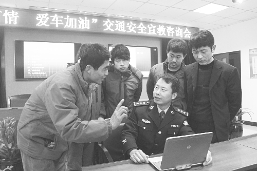 1月12日,沧州交警支队组织宣教民警来到中国电信沧州分公司开展了交通安全宣教咨询会。民警详细介绍了故意遮挡、污损、不按规定安装机动车号牌、闯红灯等违法行为的危害性以及违法行为人应承担的法律责任。同时,还通过各种典型案例向参会驾驶人讲解了一些容易引发交通事故的隐患和出行应特别注意的安全问题。图为民警就新交规实施后该公司员工遇到的问题和社会议论的热点问题进行现场解答和释疑。