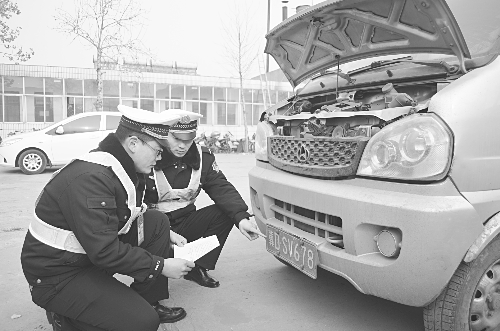 1月9日,邯郸交警五大队民警查获一辆套牌、盗抢车。当日11时许,民警在107国道检查一辆灰色长安面包车时,发现该车前挡风玻璃粘贴的年审、保险标志有伪造嫌疑,驾驶员无法出示行驶证、驾驶证。民警网上对比显示该车是盗抢车,年审、保险标志均为伪造,驾驶人属无证驾驶。图为民警对嫌疑车辆进行检查。