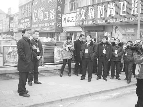 衡水市桃城区东明村被誉为衡水市第一个“中国特色村”,该村东明集团旗下有多个市场,东明集团一直十分重视治安管理和消防安全工作,先后成立了巡防队、消防队,并在各市场内安装了监控系统。近日,桃城区人大组织23名区人大代表对该村“平安市场”建设情况进行了考察。图为考察现场。