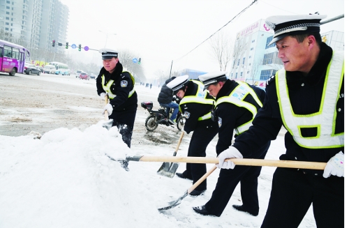 针对雪后路滑给车辆和行人交通安全带来的影响,1月21日清晨,沧州市公安交警二大队及时启动恶劣天气工作预案,在主要路口加派警力疏导交通,设置隔离设施分流车辆,并加大巡逻密度,随时消除路阻路障,保障了道路的安全和畅通。图为民警清扫路面积雪。孙明山 摄