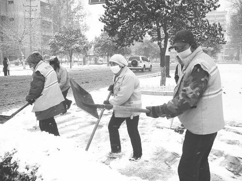 1月20日,省会石家庄普降大雪,给出行的市民和车辆带来了诸多不便。有关部门在提醒大家注意安全的同时,积极行动,安排人员排除道路安全隐患。图为环卫工人正在清除路上的积雪。