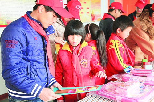 3月5日,团省委、省青年志愿者协会在石家庄天苑小学举行“志愿青春 善行河北”共青团关爱农民工子女志愿服务行动。团省委向天苑小学捐赠了300册精品图书和350件体育器材。志愿者和天苑小学的农民工子女代表前往石家庄西郊环城水系捡拾沿岸白色垃圾,开展环保宣传实践活动。图为来自“一家人协会”的青年志愿者与石家庄天苑小学的农民工子女代表结成志愿服务帮扶对子,并交换了各自精心准备的礼物。