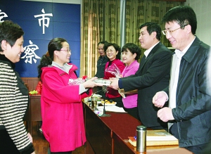 “三八”国际劳动妇女节前夕,保定市检察院组织该院40余名女检察官召开座谈会,说检察,谈自己,交流自己与检察事业共发展的体会和感悟。保定市检察院党组书记、检察长李勤出席座谈会,并代表院党组向全市女检察官致以节日的问候,勉励大家要继续弘扬团结奋斗的精神,为构建和谐社会多做贡献。图为李勤(右二)为女检察官们赠送书籍。