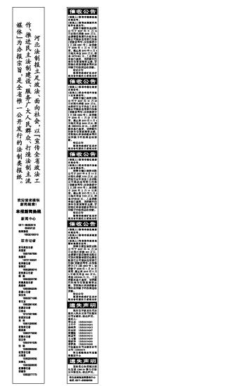 《河北法治报》(电子版)的一切内容(包括但不限于文字、图片、PDF、图表、标志、标识、商标、版面设计、专栏目录与名称、内容分类标准以及为读者提供的任何信息)仅供河北法治报、网读者阅读、学习研究使用,未经河北法治网及/或相关权利人书面授权,任何单位及个人不得将《河北法治报》(电子版)所登载、发布的内容用于商业性目的,包括但不限于转载、复制、发行、制作光盘、数据库、触摸展示等行为方式,或将之在非本站所属的服务器上作镜像。否则,河北法治网将采取包括但不限于网上公示、向有关部门举报、诉讼等一切合法手段,追究侵权者的法律责任。