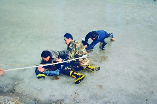 3月9日13时许,秦皇岛市开发区秦皇西大街的汤河桥下一男子因醉酒不慎坠入水中。秦皇岛消防长江道中队人员赶到现场后,立即取出救援绳,一头由在岸边的消防员拉着,另一头拴在下水救援的人员腰间,在冰面上铺上衣物后慢慢地爬向落水者。经过十几分钟的营救,男子成功获救。图为消防员营救落水者。 本报记者 刘波 摄