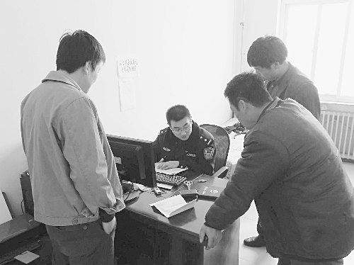为方便群众进京,大厂回族自治县公安局祁各庄派出所民警放弃休息时间,加班加点为群众办理核发进京安检证和进京安全温馨提示卡,受到群众欢迎。截至目前,该所已发放安检证84张、进京安全温馨提示卡500余份。图为民警正在为群众办理安检证。