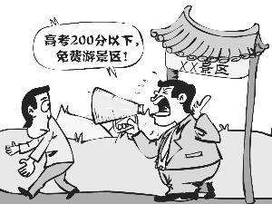 河南高考分数线公布后,南阳市旅游局刊登大幅公益广告,承诺凡今年高考分数在200分以下的考生,在9月30日之前,凭准考证、高考成绩单或省招办发布的成绩短信,可免费游览南阳11家景区。消息一经发出,有人赞扬支持,也有人直斥当地在作秀,只为制造噱头宣传景区。 薛红伟 作