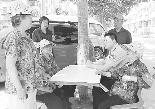 5月下旬开始,廊坊市公安局安次分局南门外派出所在辖区亿合小区组织了一支“大妈”志愿巡逻队,成员都是小区内离退休老干部和职工,她们平日里关注小区治安状况,积极自发申请志愿配合派出所工作,及时发现违法犯罪。图为社区民警对大妈们在巡逻过程中需要注意的安全问题和巡查事项进行指导。