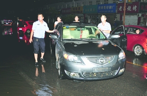 7月8日晚,邯郸遭遇强降雨,邯郸市交警支队紧急启动《强降雨防汛抗灾预案》,全体民警及时上岗,在积水较多地段设置“危险地点”、“禁止通行”、“车辆请靠右缓行”、“请绕行”等大型标志标牌。协管员协助指挥车辆和行人,确保主要道路行车秩序不乱。邯郸市交警支队还与救援公司联系,借用清障车,随时对市区主干道抛锚的车辆实施清拖。经过严防死守、适时采取交通管控措施,确保了全市无一起人员伤亡事故发生。图为执勤民警将抛锚车辆推到路边,等待救援。