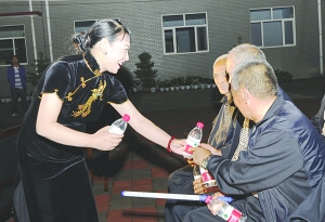 图为靳玲展在演出现场给老年村民递上矿泉水的情景。