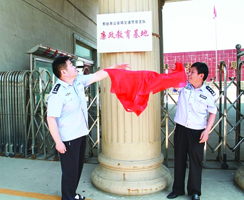 7月5日,邢台市交警支队首个廉政教育基地在邢台市公安局第一看守所举行启动仪式。支队干警实地参观了看守所监控中心、各监室和警示教育基地。通过实地观看看守所监管情况,全体人员受到了深刻触动,纷纷表示一定要珍惜工作岗位,坚持为警清廉,公正执法,始终做到清清白白做人,明明白白做事,自觉树立公安交警的良好形象。图为该支队党委副书记、政委程寿强和看守所所长刘俊凯为教育基地揭牌。