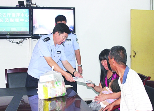 7月24日9时许,成安县公安局巡特警大队民警根据县局指挥中心指令,在该县老汽车站附近发现一名被遗弃的男童。民警将男童安置到民政部门后,通过各种方式帮助孩子寻找亲人。7月29日上午,一对老年夫妇自称是孩子的爷爷、奶奶,找到成安县公安局。原来,因害怕孙子影响儿子再婚,一时犯糊涂的爷爷竟将自己一岁零两个月的孙子遗弃。面对不断的寻亲信息,承受着良心谴责的老人按图索骥来到公安局寻回孙子。临行前,成安县公安局长、政委还专门为孩子购买了衣服和食品。 赵钊 赵晓萌 摄