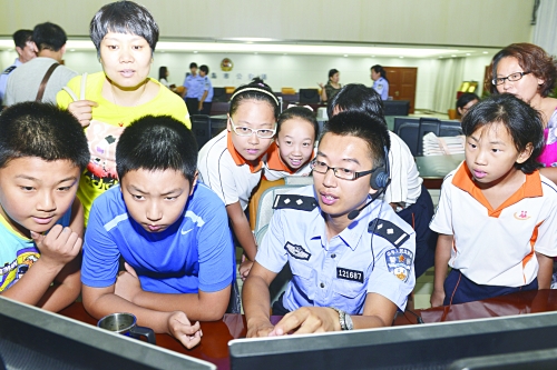 8月6日,秦皇岛市公安局公交分局把参加普法夏令营的小学生及家长、老师请到局里,现场讲解反扒和防诈骗知识,展示了管制刀具等违法器械,并现场返还了受害人被骗财物,使师生家长受到了生动具体的法律常识教育。图为民警利用网络系统为学生们讲解报警流程。