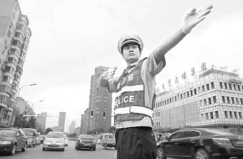 7月以来,唐山市交警支队组织机关200多名民警,在保证完成本职工作的同时,早7时至8时、晚6时至7时交通高峰时段,在市中心区12个路口上岗执勤,既充实了一线执勤警力,又转变了机关民警的工作作风。图为该支队特勤大队民警在煤医道和建设路交叉口指挥疏导交通。