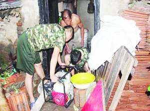 到达现场后,消防官兵与先行到达现场的镇政府、村委会两级干部了解灾情,根据住户灾情大小、难易程度等因素,消防官兵先疏散群众,然后采取人工排水和手动抽水泵排水两种方式进行有效排水。