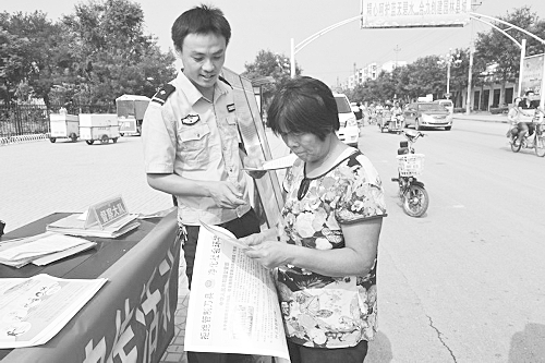 为进一步构建和谐警民关系,8月13日,广宗县公安局组织民警在沙丘苑公园举行公安民警送方便活动。图为民警在为群众讲解法律常识。