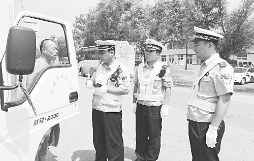 为确保暑期交通安全,青龙满族自治县公安局科学安排警力,有针对性地设置巡逻防控点,对主要路段、重点车辆逐一进行安全检查。图为该县公安局交警大队祖山中队民警正在对过往车辆进行安全检查。戴燕山 摄