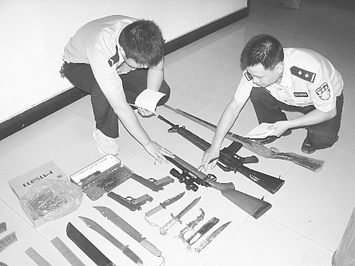 为严密防范、严厉打击涉枪涉爆涉刀等违法犯罪行为,8月份以来,柏乡县公安局在全县范围内组织开展了收缴枪支弹药、爆炸物品、管制器具统一行动,对沿街门市、空旷厂房、出租房屋及校园周边进行了彻底排查。截至目前,共收缴枪支5支、砍刀12把和部分子弹。图为民警正在清点收缴的枪支、刀具。
