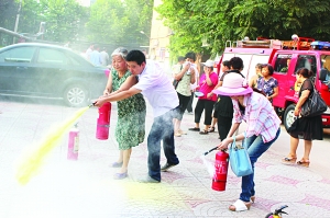 为使更多的居民能熟悉掌握灭火器的使用,在宿舍区的停车场,槐北路消防中队中队长戎凯还为居民们详细讲解了火场逃生常识、灭火器的使用方法等消防知识,并组织大家进行了“油盆”火灾灭火演练。使此次演练达到了预期效果,赢得了居民们的一致好评。
