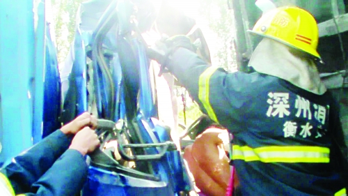 8月26日14时40分,衡水市深州消防中队接到报警称:位于石黄高速深州段,距深州东高速口500米处发生一起货车追尾事故,有人员被困,情况紧急,请求救援。14时55分救援人员到达现场。为避免二次伤害,救援人员将被撞车的车斗升起,利用液压扩张器、液压剪短钳等破拆工具将车辆挤压变形部分进行扩张,经过20分钟紧张的工作,成功将被困者救出,并火速送往医院进行救治。