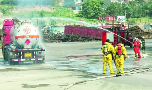 井陉县公安消防大队第一时间接到报警后,消防大队长费海新一面向石家庄市消防支队指挥中心和县政府报告,一面带领救援中队15名消防官兵,出动一辆化学事故抢险消防车、两辆水罐消防车、两辆泡沫车赶往现场。