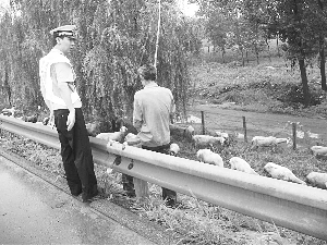 9月1日10时18分,高速交警新乐大队一中队中队长王开元及民警沿辖区京港澳高速公路巡逻时,发现一男子手握羊鞭在放羊,路边几十只羊正在啃着青草,有的都越过护栏跑到高速公路上,王开元立即上前劝阻。