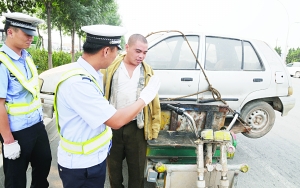 9月6日上午9时30分许,在沧州市区长芦大道南端,一辆小电瓶车驮着一辆报废的轿车,摇摇晃晃行驶在机动车道内。沧州市公安交警二大队巡逻民警发现后,立即将小电瓶车截停,责令驾驶人驶入非机动车道,对司机进行了严肃的安全教育,并联系了牵引车辆。