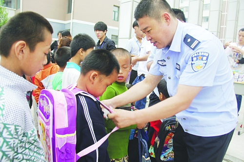 9月5日,广平县百度广平贴吧组织了“鹅城聚真情 贴吧献爱心”活动,社会各界爱心人士为残疾孩子捐赠了价值6000多元的学习用品。组织此次活动,目的在于鼓励社会各界关爱儿童,关注弱势群体,奉献爱心。图为广平县公安局民警把自己捐赠的书包挎在残疾孩子肩上。 程学虎 尹书光 摄