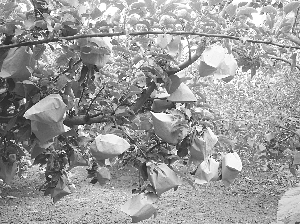 富岗公司生产技术服务部的两名技术员立即打电话,叫人送来了10万个苹果袋。在苹果园里,技术员手把手教他们怎么套袋,直到他们学会为止。技术员再三嘱咐他们,根据《富岗有机苹果128道生产工序》,套袋前必须喷施生物杀虫剂和生物杀菌剂清理果面,以防病虫害在袋内滋生,无法防治。但是硫酸亚铁和硫酸锌,套袋前千万不能使用,必须使用时,也要等到套上袋以后,以免使果面产生药害,影响果品质量。