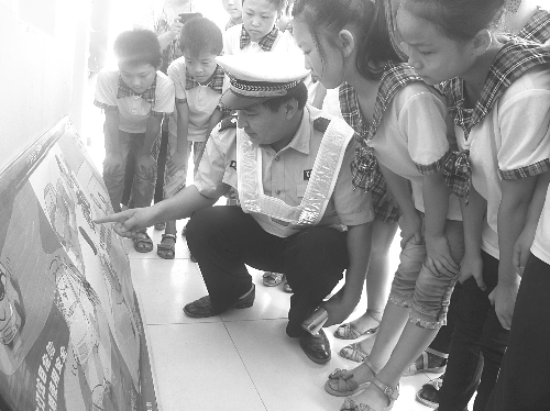 广平县交警大队组织民警广泛深入到辖区各中小学校、幼儿园,通过上交通安全课、观看宣传光盘、观看展板等形式,上好“交通安全课”。图为民警在展板前向学生讲解交通安全常识。 程学虎 摄