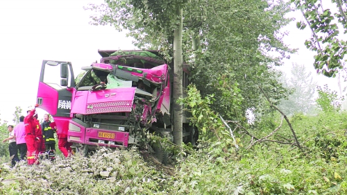 后八轮自卸货车撞到一棵大树上